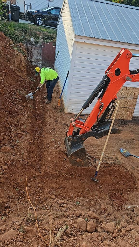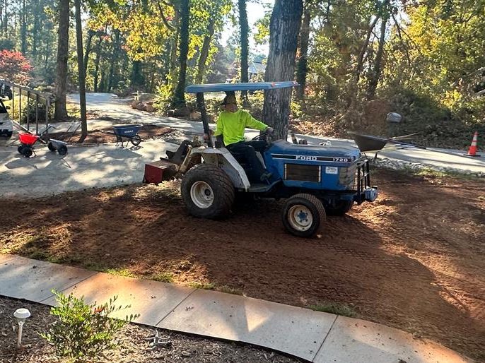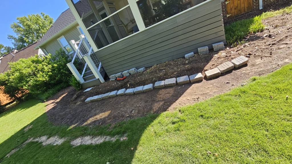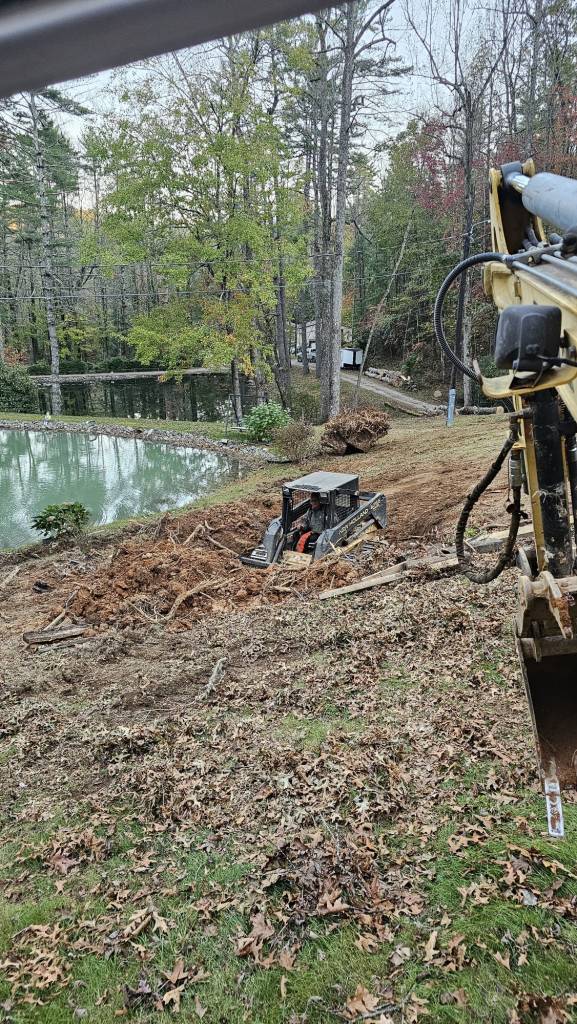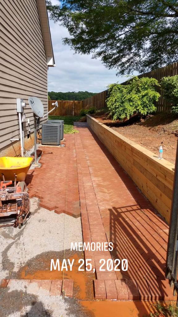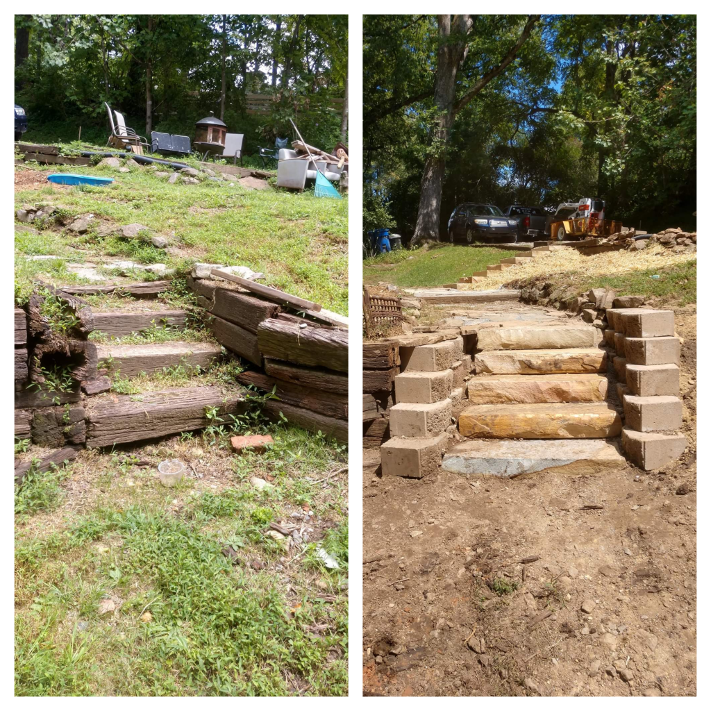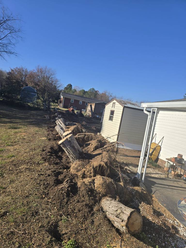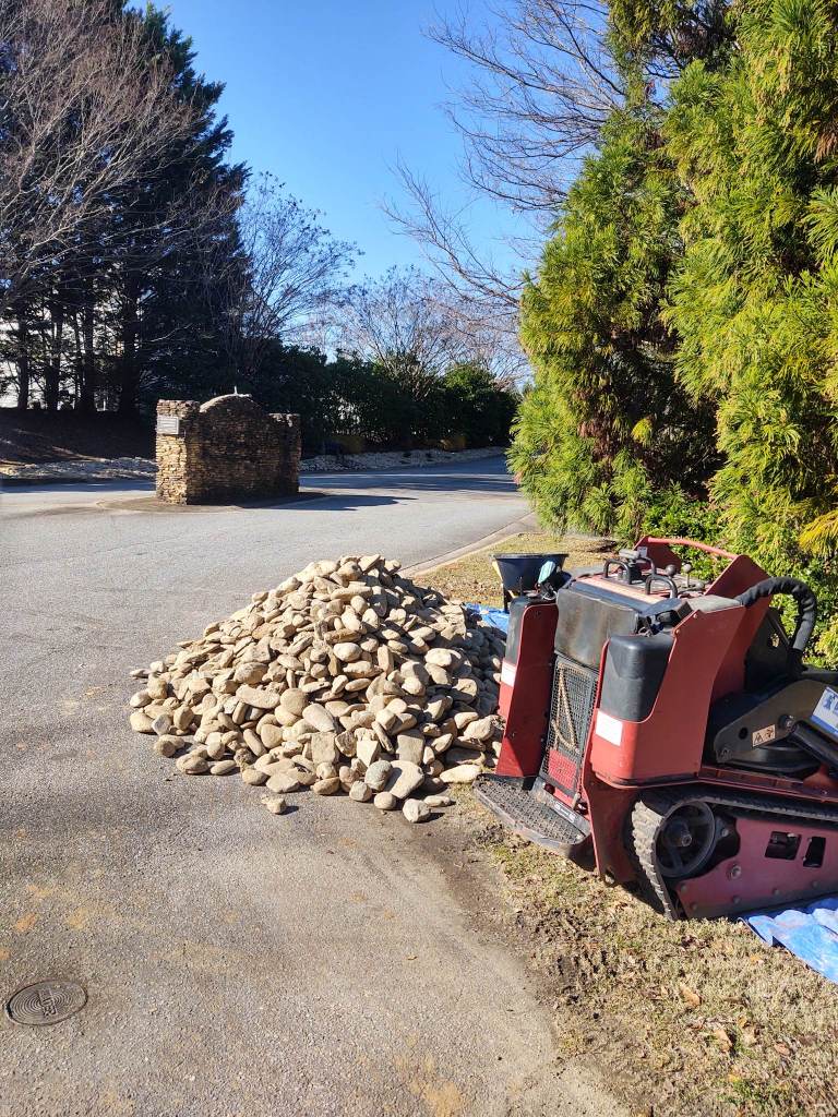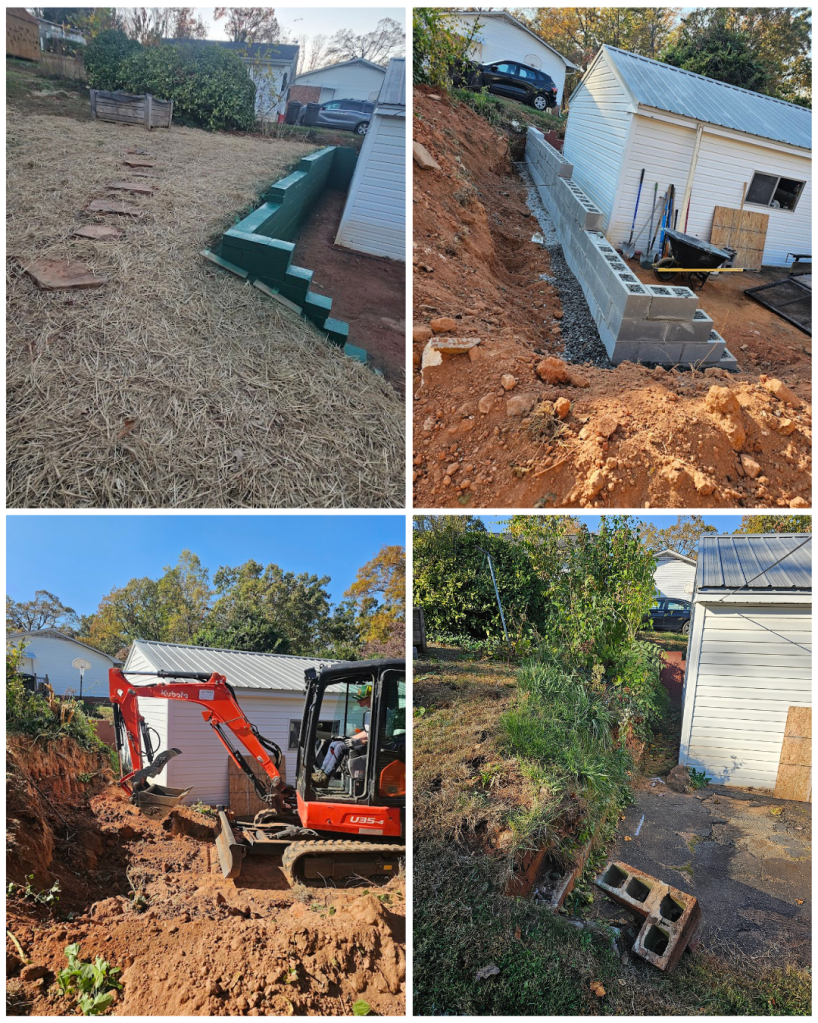 retaining wall installPrepping footer for retaining wallfull property installRiver Rock Bed Installafter driveway installbefore drivewayremoving stumpsbefore stumps removedafter stumps removedprepping for seeding