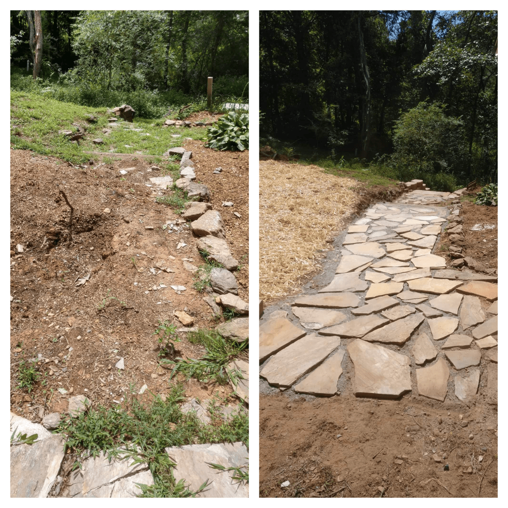 Tree removal, Stump grinding, grading, fresh topsoil, fresh sod, walk path and mulch to wrap up this design. (photo below after it established)